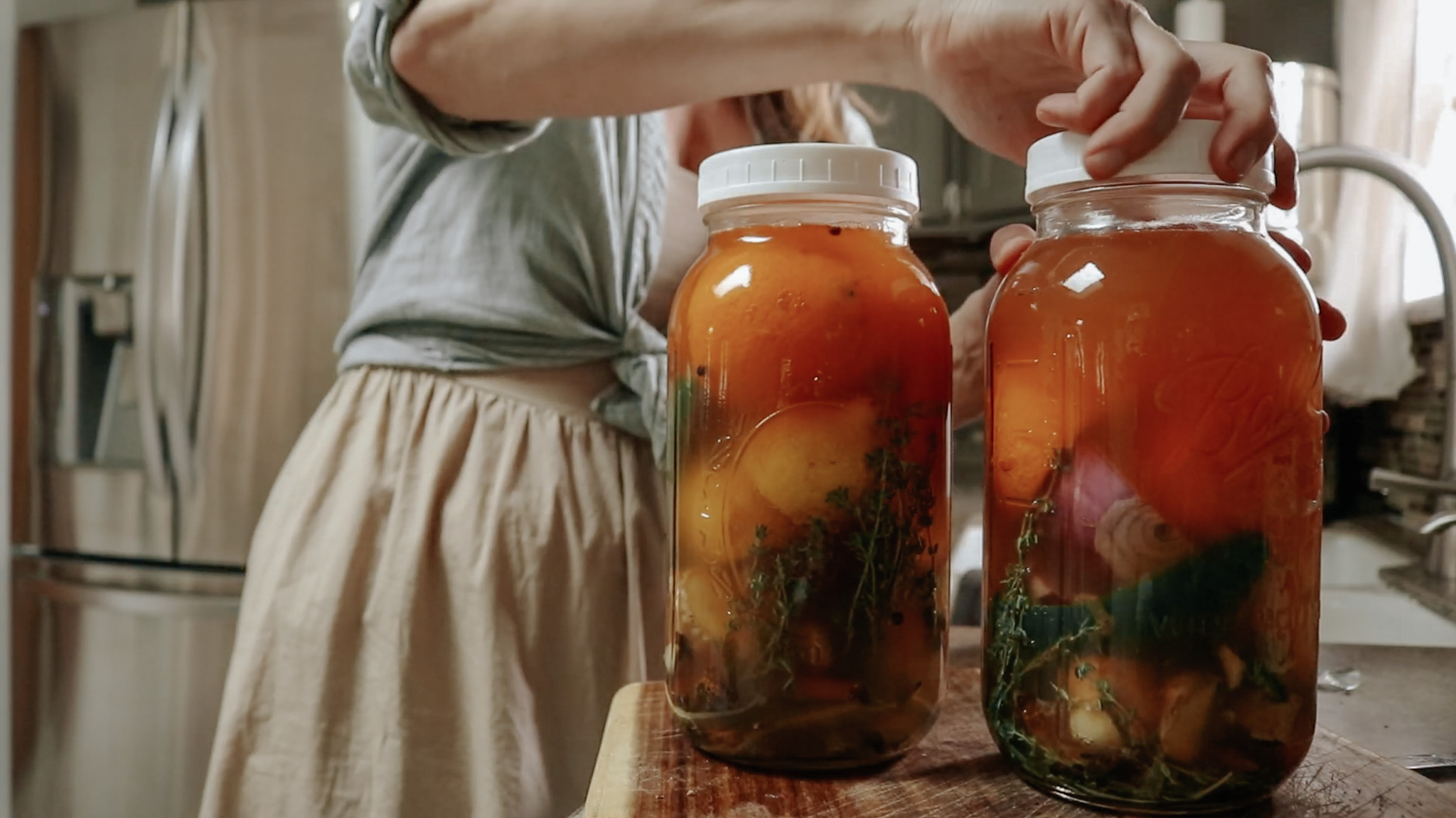 - Prepare all the ingredients as directed above and place in a large mason jar ending with the lemon and oranges on the top of everything else (these keep all other ingredients below the ACV).